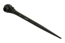 Twin-sized ratcheting podger spanner with a long, tapered shaft for easy alignment of component holes and a 17mm and 19mm Bi-Hex (12pt) ratchet head for fast assembly. Manufactured from chrome vanadium with a durable black phosphate finish and a hole for safety cord attachment. A professional tool ideal for scaffolding and construction use, precision engineered to ANSI and DIN standards.