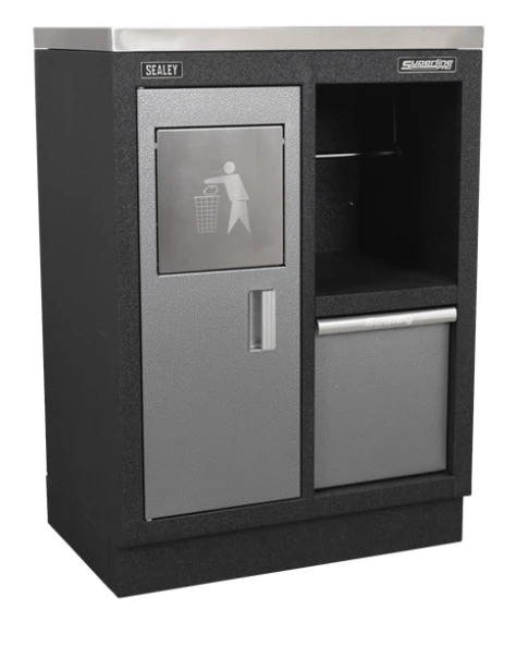 - Solid multifunction modular cabinet includes rubbish bin, paper roll holder and a deep drawer.