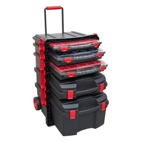 - Fully mobile with two heavy-duty wheels and a retractable handle.